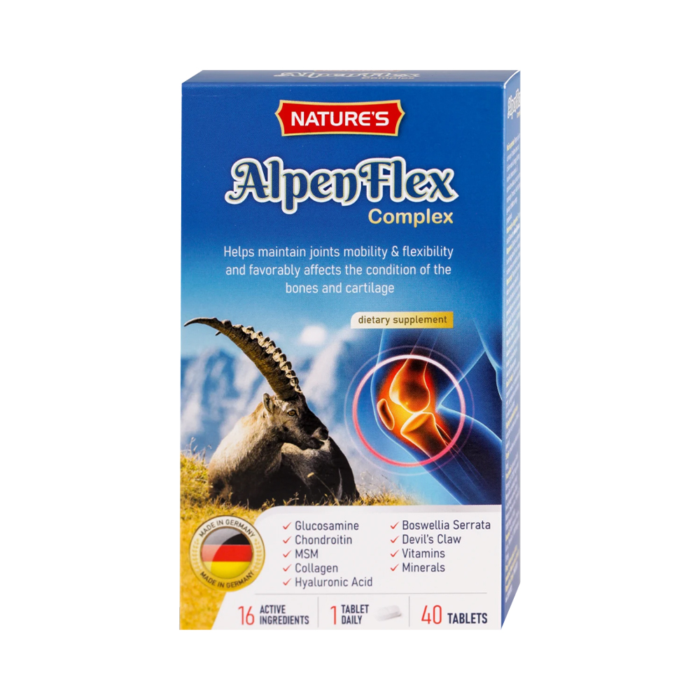 Комплексот Alpen Flex е избалансирана комбинација од 16 активни состојки за одржување на нормалната функција на зглобовите, коските и ‘рскавицата, подвижноста на зглобовите и одржување на еластичноста на сврзните ткива и тетивите. Мулти-комплексната формулација се заснова на принципот на снабдување на телото со важни биоактивни хранливи материи, растителни состојки, витамини и минерали за нормално одржување на коскено-зглобниот систем.