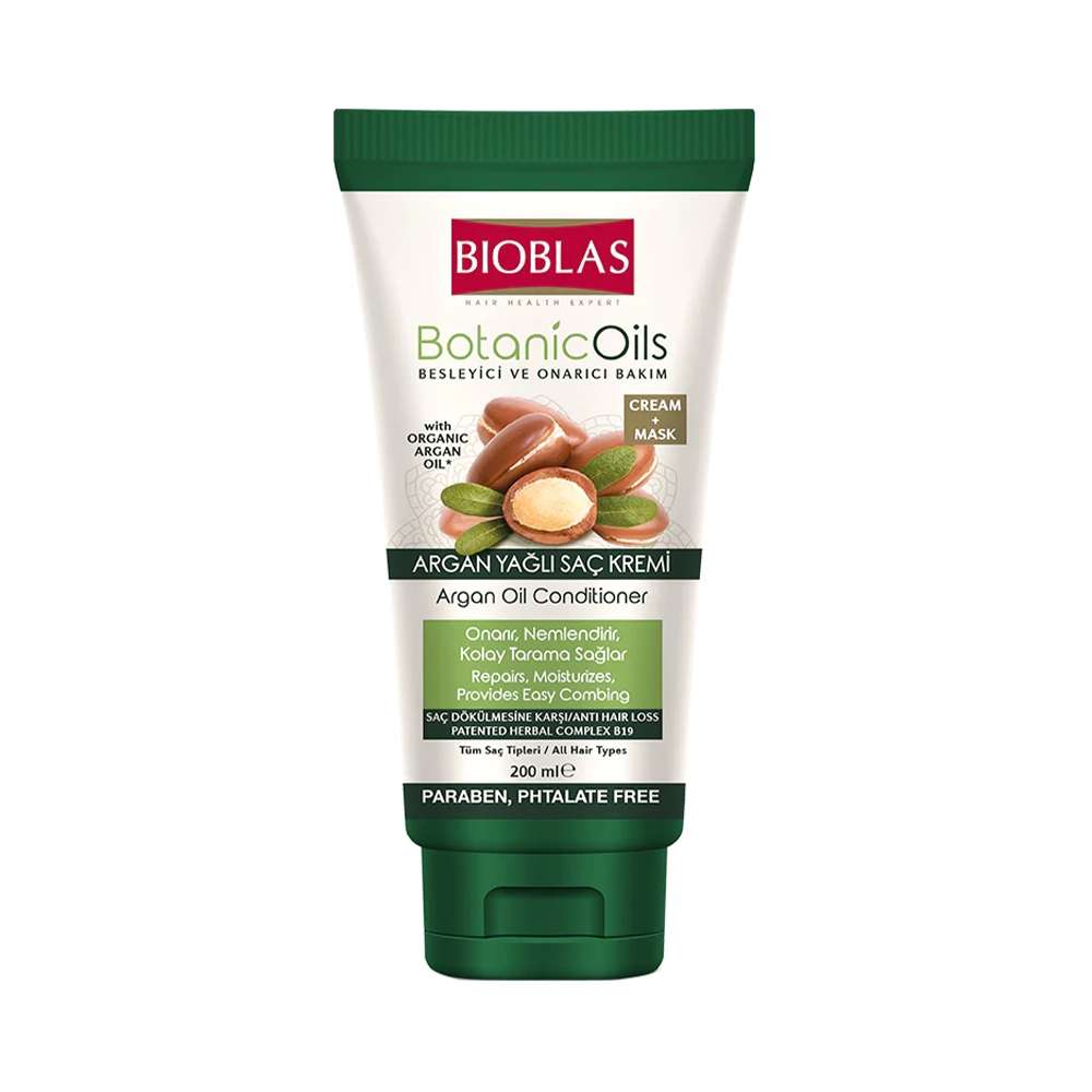 Маската за коса со масло од арган на Bioblas, со патентиран хербален комплекс Б12 против опаѓање, е погодна за сите типови коса.